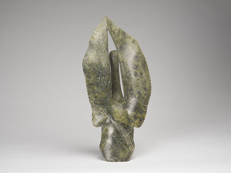 Abraham Etungat was a distinguished Inuit sculptor celebrated for his dynamic depictions of birds, particularly those with outstretched wings. Among his most renowned works is Bird of Spring, a masterpiece that captures the essence and movement of avian forms with exceptional grace. Originally carved as a 14 cm stone sculpture, the piece was later reproduced in a series of seven-foot bronze statues between 1980 and 1981. These monumental works are displayed in prominent public spaces across Canada, including Vancouver, Calgary, Toronto and Halifax, symbolizing the arrival of spring and the renewal it brings.Bird with Upswept Wings is a striking reinterpretation of the iconic sculpture, rendered here in a dramatically larger scale. At 41 cm high, it is one of the largest examples we have encountered. With wings extended well above the bird's head, this piece differs from the original carving but retains the same vitality and elegance, making it a cherished piece among collectors and art enthusiasts alike.