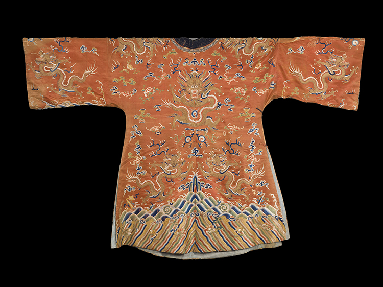 The first an orange ground dragon robe from the Guangxu Period (1875-1908); the second a mid 19th Century silver and blue panel that was formerly a dragon robe