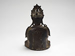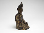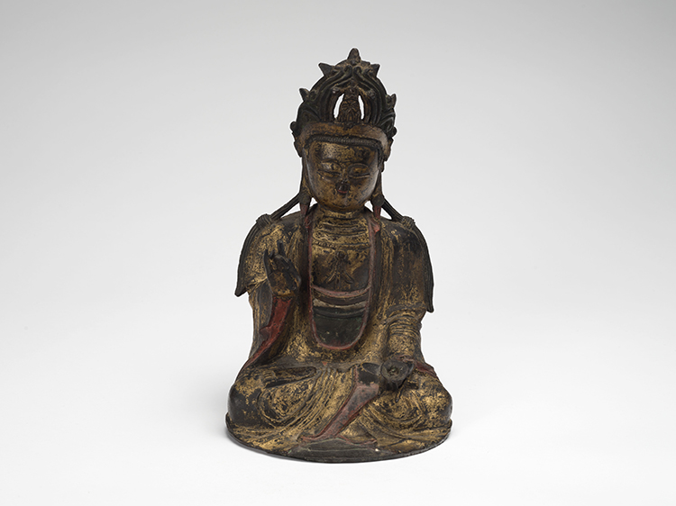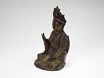 The bodhisattva of compassion seated in lotus position while wearing long flowing robes, the left hand holding a small cup, the right a piece of fruit, the fleshy face supporting a high crown containing a miniature figure of Amitayus, remnants of gilding and coloured pigments throughout.