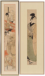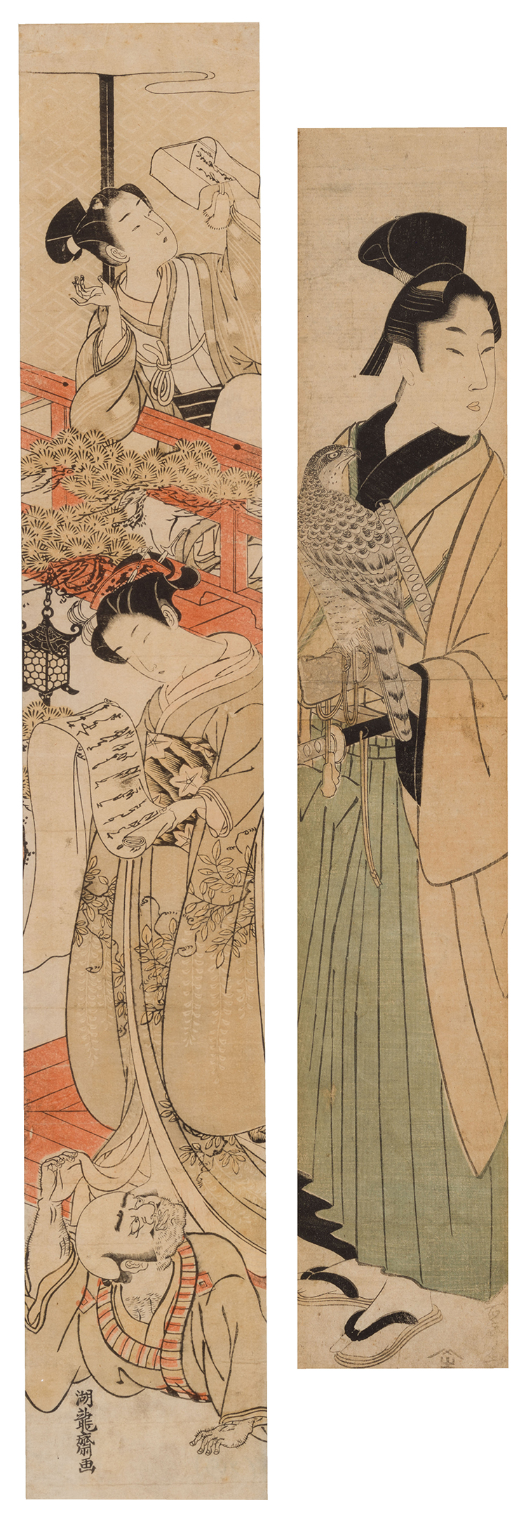 Both vertical pillar print format. The first by Koyusai (1735-1790) and depicts a man and a woman reading letters; the second a young samurai and his falcon.Please note: the dimensions listed are for the larger print.