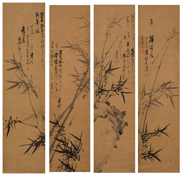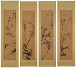 Ink on paper, mounted with silk, unframed. Each signed Guanqiao with inscriptions. With six artist seals in total and each with a collector seal of Yang Yun-pin (1906-2000), “Dong Ning Yang shi Xijing lou cang”. Dated wuwu (1858) with a dedication on the last scroll.Please note: each full sheet measures 65 1/4 x 17 7/8 inches.Please note: this work is unframed.