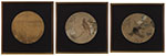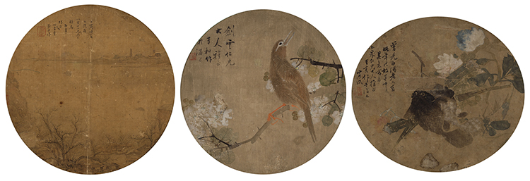 Each ink and colour on silk. Includes a landscape scene, a brown bird on a prunus branch, and two goldfish amongst river plants. Each with calligraphy and red seal marks. Framed. Please note: the largest sight is 9 inches in diameter with all three having approximately the same diameter. The frame size of the largest work is 14 1/2 x 15 inches.