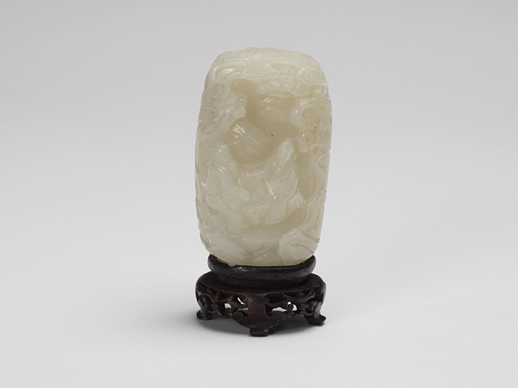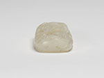 Of pebble form with one side carved with two scholars playing Weiqi under a canopy of pine, the reverse with a scenic view of clouds and a sky. The stone an even white colour.