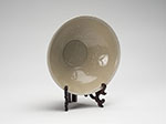 Of a light olive tone, the bowl with a raised flaring rim that is unglazed, the interior decorated with raised florals, the exterior with chrysanthemum petals.