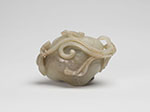 Naturalistically carved as a lotus pad borne on long, leafy and budding stems growing from one side of the cup to form the handle. With incised details and decorative pod and leaf carved in high relief.