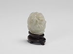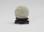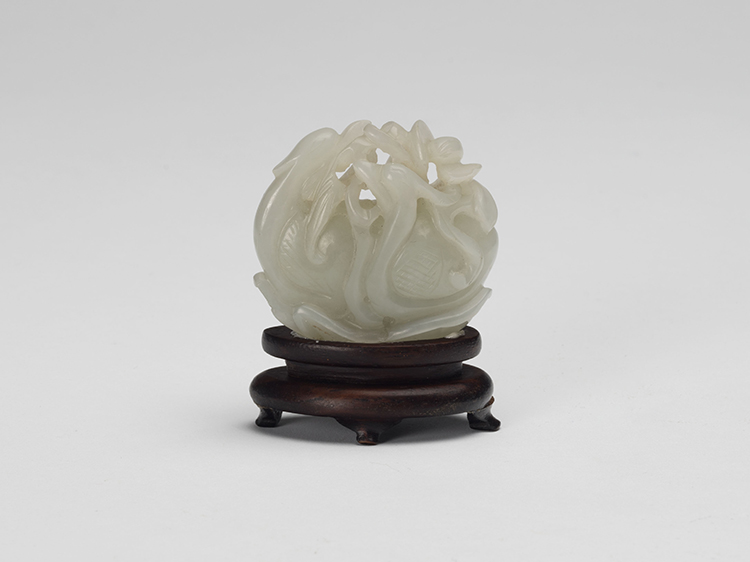 Reminiscent of the Yuan-style with its reticulated carving, the goose holding various river plants while seated on a lotus pad. The stone a clean white tone throughout.