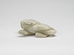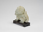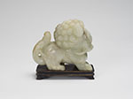 Modeled standing solemnly with its head tilted slightly to one side. Finely incised with lines to highlight the details in its face, mane, and tail. Together with a custom wood base.