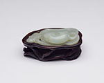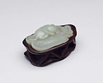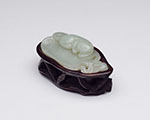 The recumbent cat seated on a large Daoist fan, the stone of an even pale celadon tone.