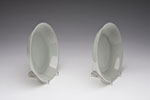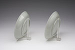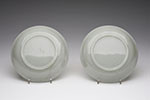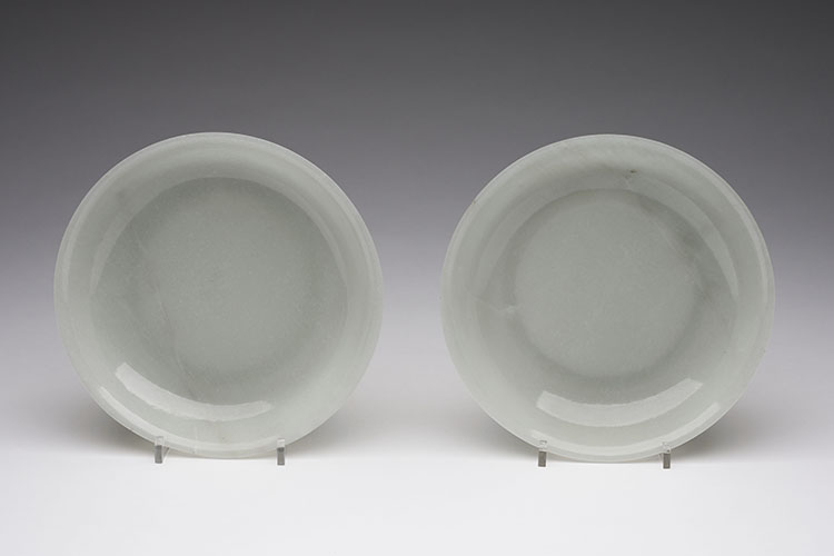 Each with shallow rounded sides and flaring rim, the base raised on a thick circular foot. Each stone of a fine white tone with natural striations.In addition to being a pair, the present lot is rare for its expert carving and quality of the nephrite material. Both dishes are finely carved in their large and elegant proportions, while the stone is an even white tone throughout, thus showcasing the skillful abilities of the Qing Dynasty jade workshops.Please note: the dimensions listed are for one of the dishes.