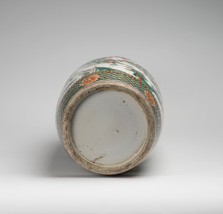 Enameled in famille verte palette to the cylindrical body with continuous figural narrative scenes in mountainous landscape. The shoulder is decorated with landscape cartouches reserved on a diaper ground. With foot rim unglazed.