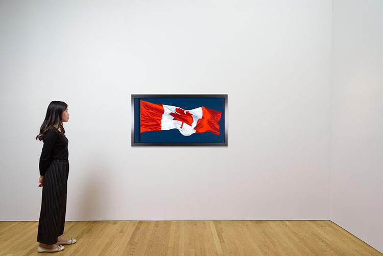 Viewed from below, depicted billowing in the wind, Pachter elevates the Canadian flag as the symbol of a country, nation and place to something dynamic, theatrical and grand. Pachter places the Canadian identity at the centre of his artistic investigation and, as asserted by literary critic David Staines, “compels us to reconsider these familiar signposts in our collective memory.” The undulating flag is a signature emblem that encapsulates Pachter’s investigation of, and devotion to, the Canadian identity.